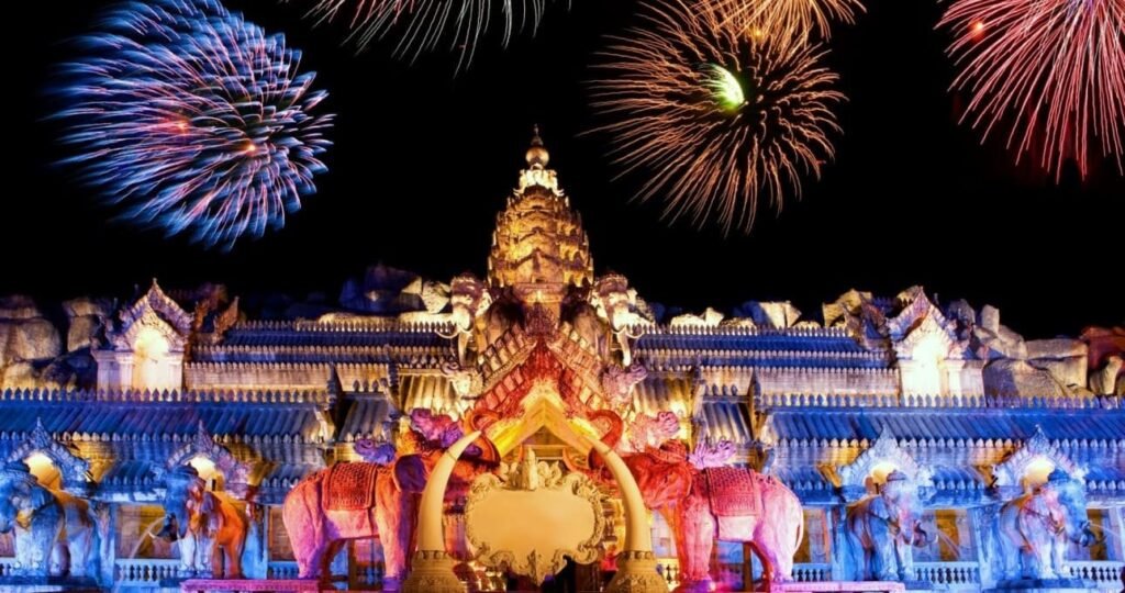 - عرض مسرحي يشمل راقصين، أفيال وألعاب نارية