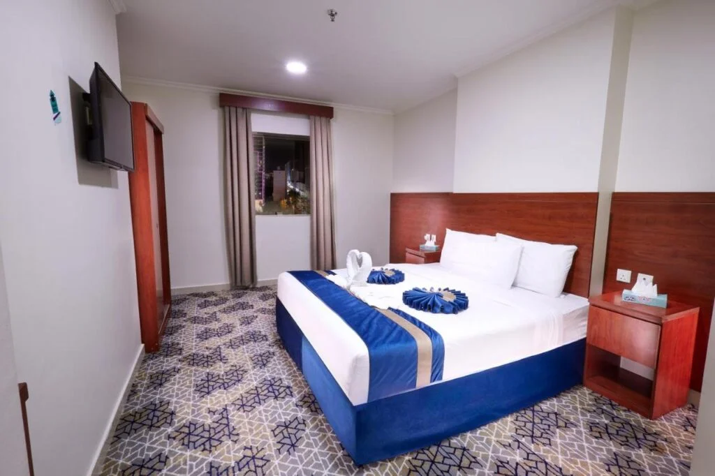 الغرف واسعة ومجهزة بأثاث عصري أنيق، تحتوي على مكتب عمل، شاشة مسطحة، حمام خاص بلوازم استحمام مجانية، وأسرة مريحة تضمن نومًا هادئًا بعد يوم طويل من المناسك.